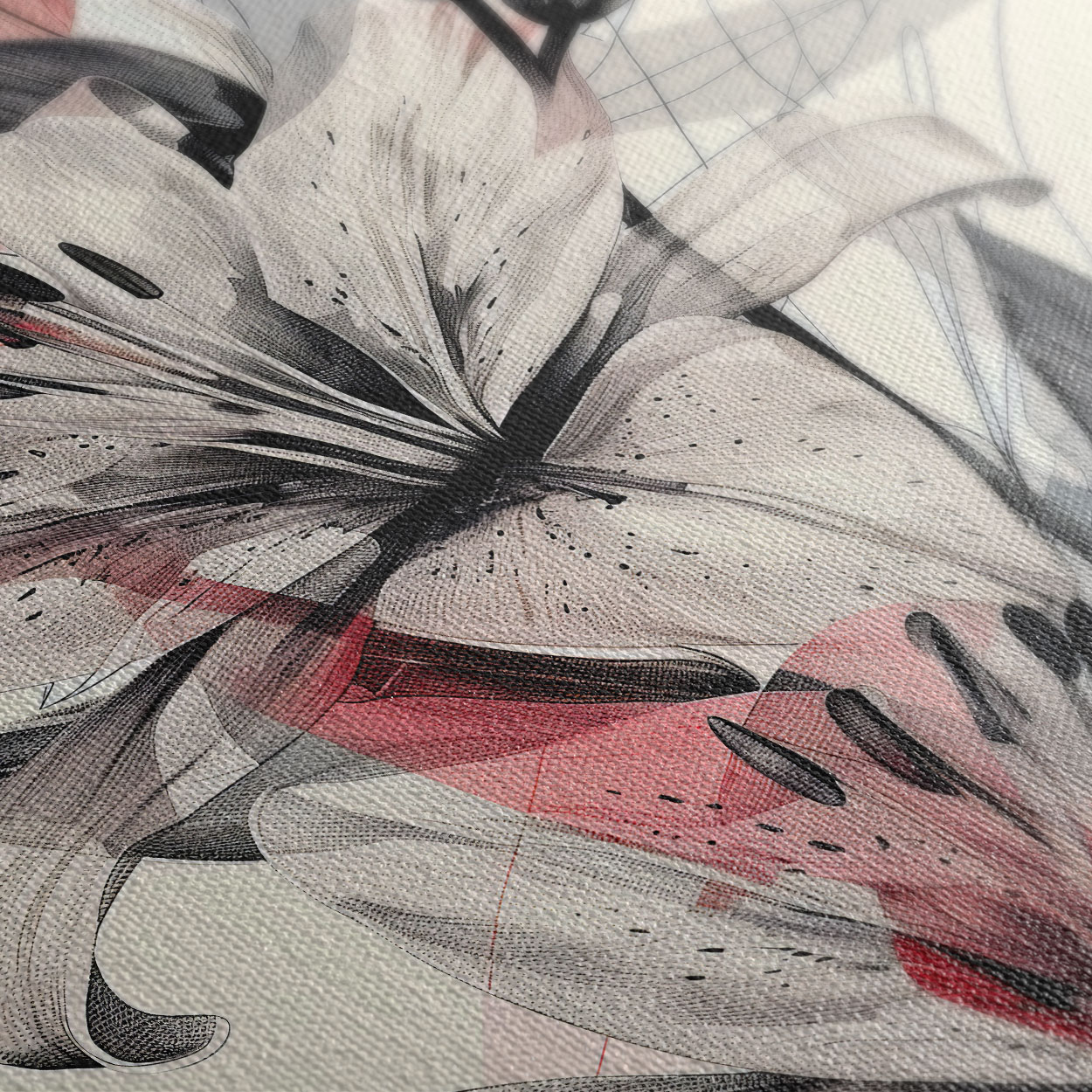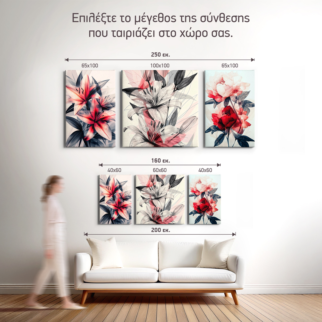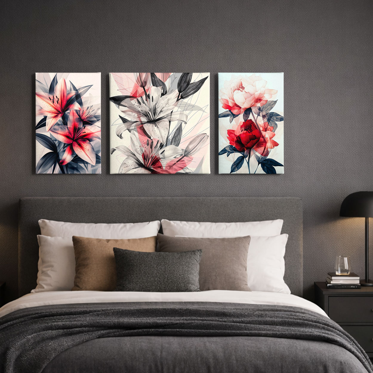 Προσθέστε μια νότα εκλεπτυσμένης πολυτέλειας στην κρεβατοκάμαρα ή το σαλόνι σας με τη σύνθεση "Velvet Petals". Αυτό το εντυπωσιακό τρίπτυχο συνδυάζει την κλασική ομορφιά των λουλουδιών με μια σύγχρονη, σχεδόν διάφανη (X-ray) καλλιτεχνική προσέγγιση. Οι βαθιές αποχρώσεις του κόκκινου και του ροζ έρχονται σε τέλεια αντίθεση με τις γκρίζες και μαύρες λεπτομέρειες των φύλλων, δημιουργώντας ένα βάθος που μαγνητίζει το βλέμμα και αναβαθμίζει κάθε τοίχο.