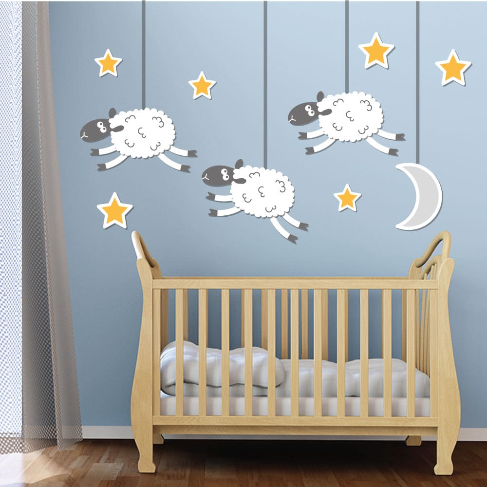 Αυτοκόλλητο για παιδικό δωμάτιο κρεμασμένα προβατάκια και φεγγαράκι με αστεράκια.