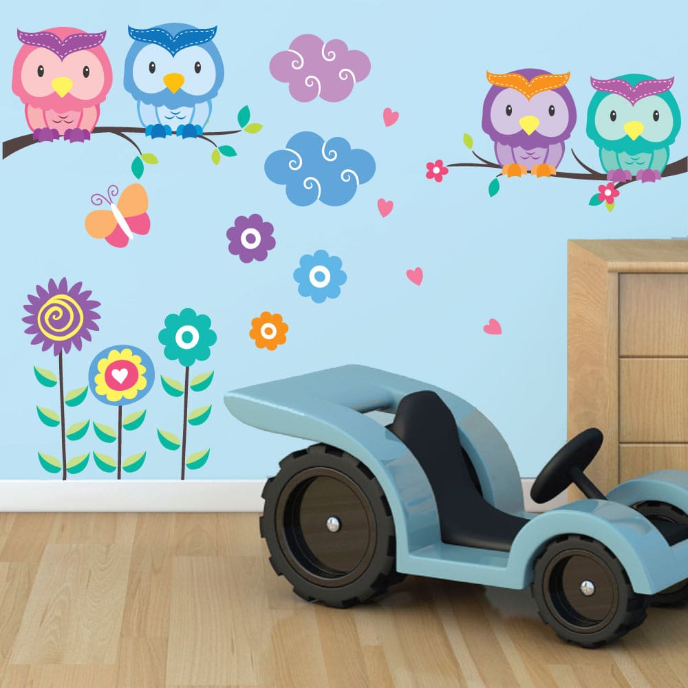 Αυτοκόλλητο για παιδικό δωμάτιο υπέροχες πολύχρωμες κουκουβάγιες με λουλουδάκια και συννεφάκια.
