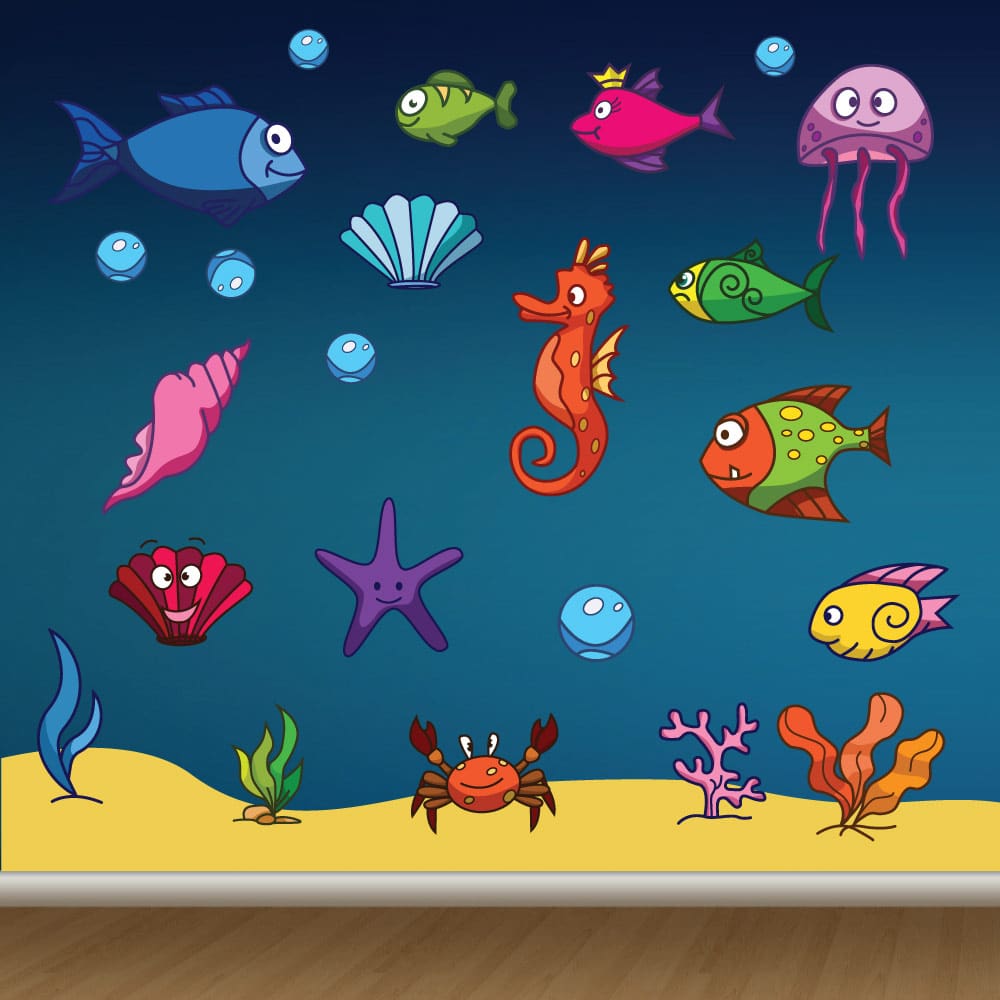 Αυτοκόλλητο για παιδικό δωμάτιο ψαράκια και κοχύλια στον βυθό της θάλασσας.