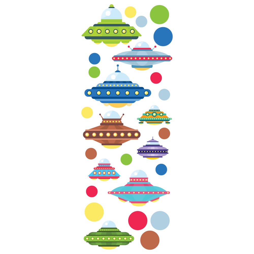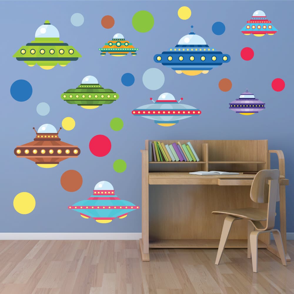 Αυτοκόλλητο για παιδικό δωμάτιο ιπτάμενοι δίσκοι εξωγήινων και πολύχρωμες βουλίτσες.