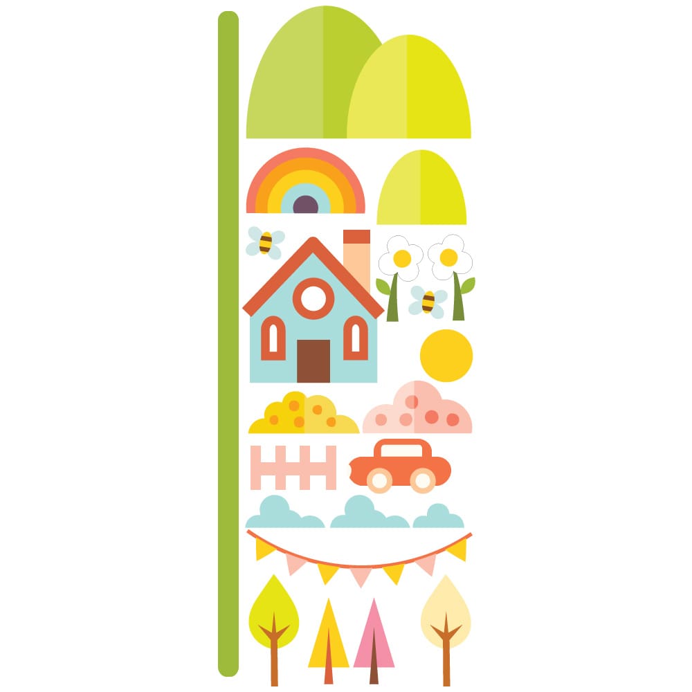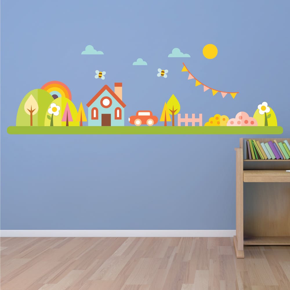 Αυτοκόλλητο για παιδικό δωμάτιο χαρούμενο σπίτι στο χωριό με δεντράκια λουλουδάκια και συννεφάκια.