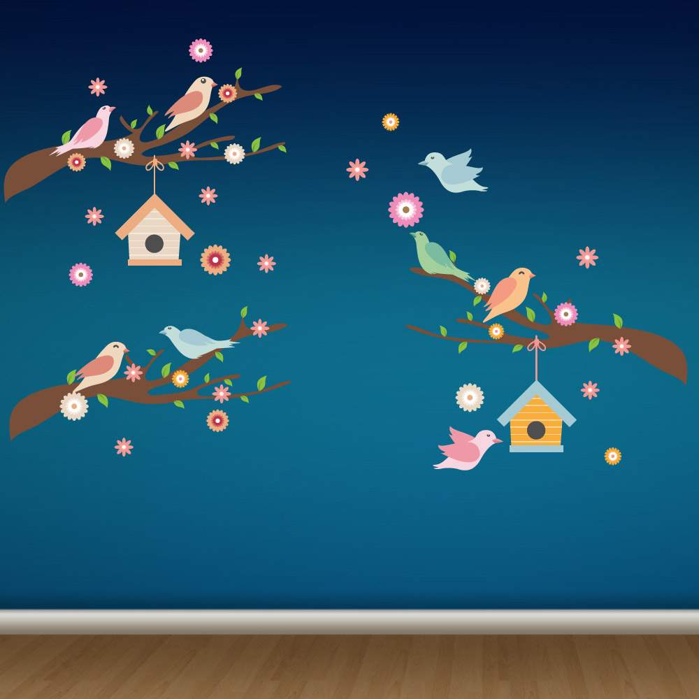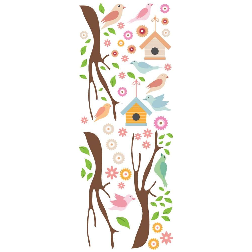 Αυτοκόλλητο για παιδικό δωμάτιο πουλάκια σε κλαδάκια με φύλλα και λουλουδάκια.