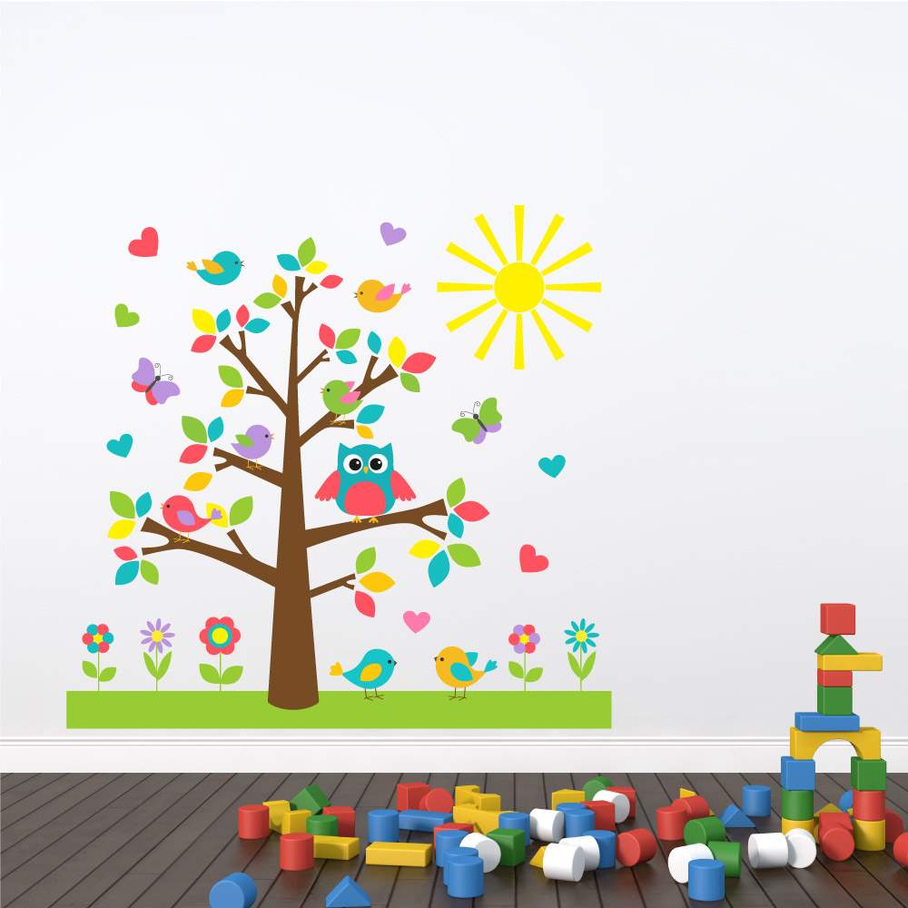 Αυτοκόλλητο για παιδικό δωμάτιο κουκουβάγια σε δέντρο με πολύχρωμα φύλλα και καρδούλες.