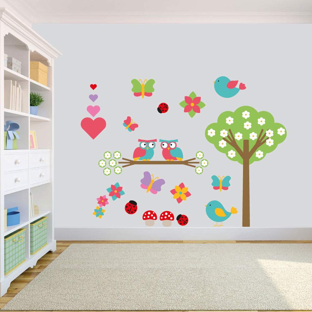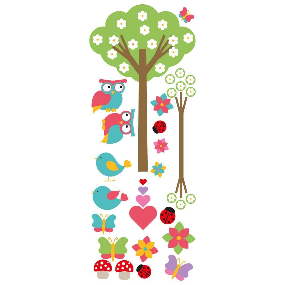 Αυτοκόλλητο για παιδικό δωμάτιο δέντρο και κουκουβάγιες σε κλαδί μαζί με πολύχρωμες πεταλούδες και λουλουδάκια.