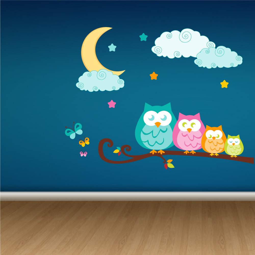 Αυτοκόλλητο για παιδικό δωμάτιο κουκουβάγιες σε κλαδί την νύχτα με φεγγάρι και σύννεφα.