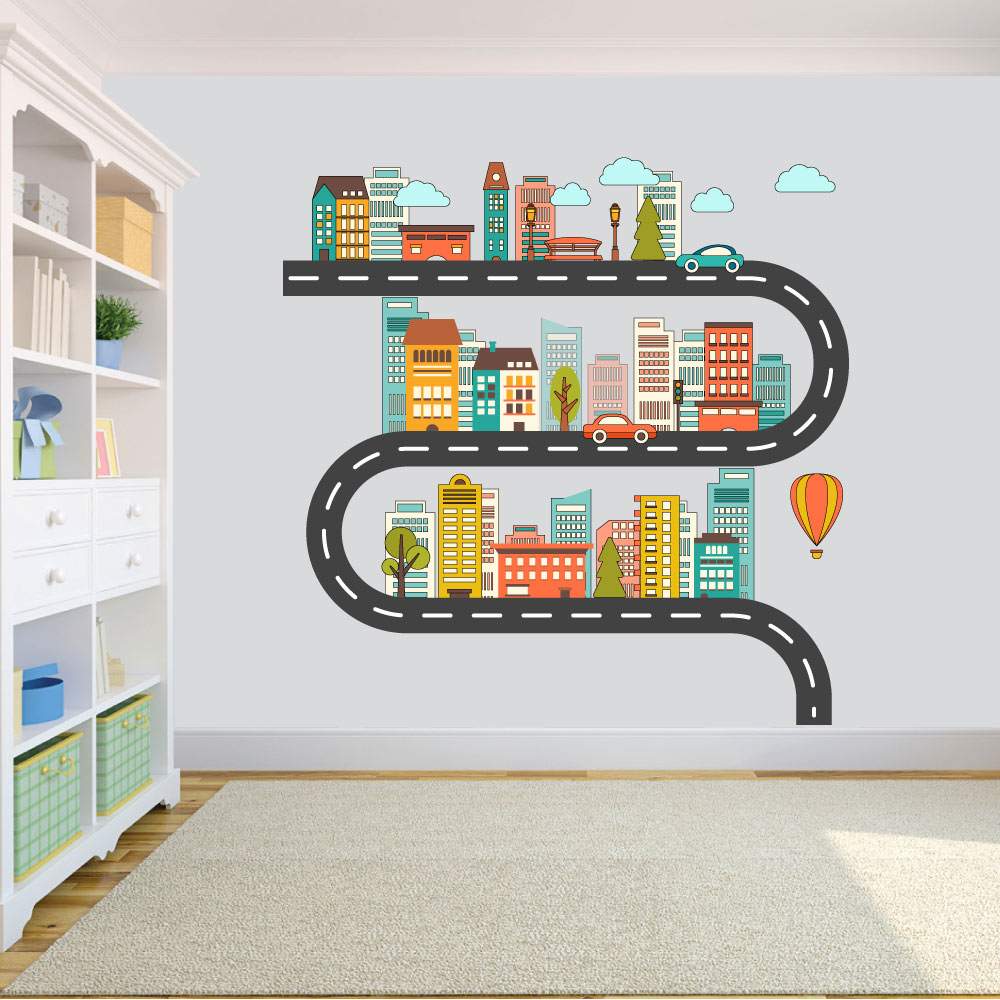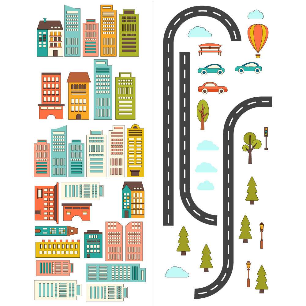 Αυτοκόλλητο για παιδικό δωμάτιο πολύχρωμες πολυκατοικίες, δρόμοι και αυτοκινητάκια.
