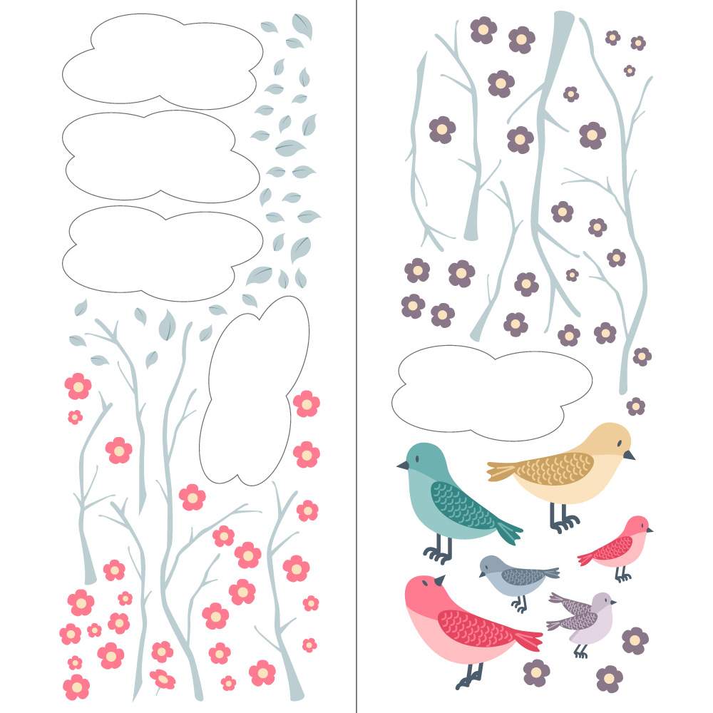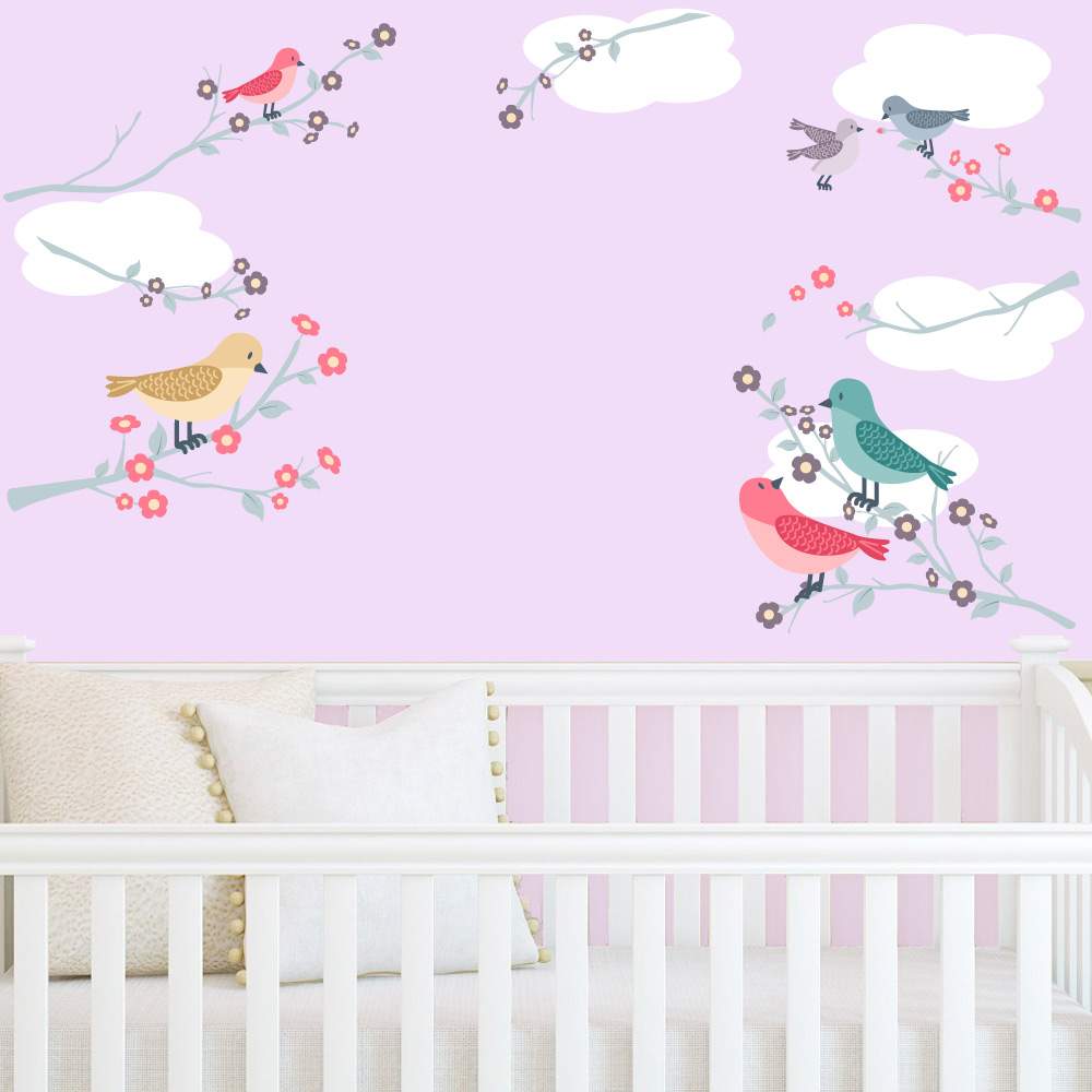 Αυτοκόλλητο για παιδικό δωμάτιο πουλάκια ανάμεσα σε ανθισμένα κλαδάκια και συννεφάκια.