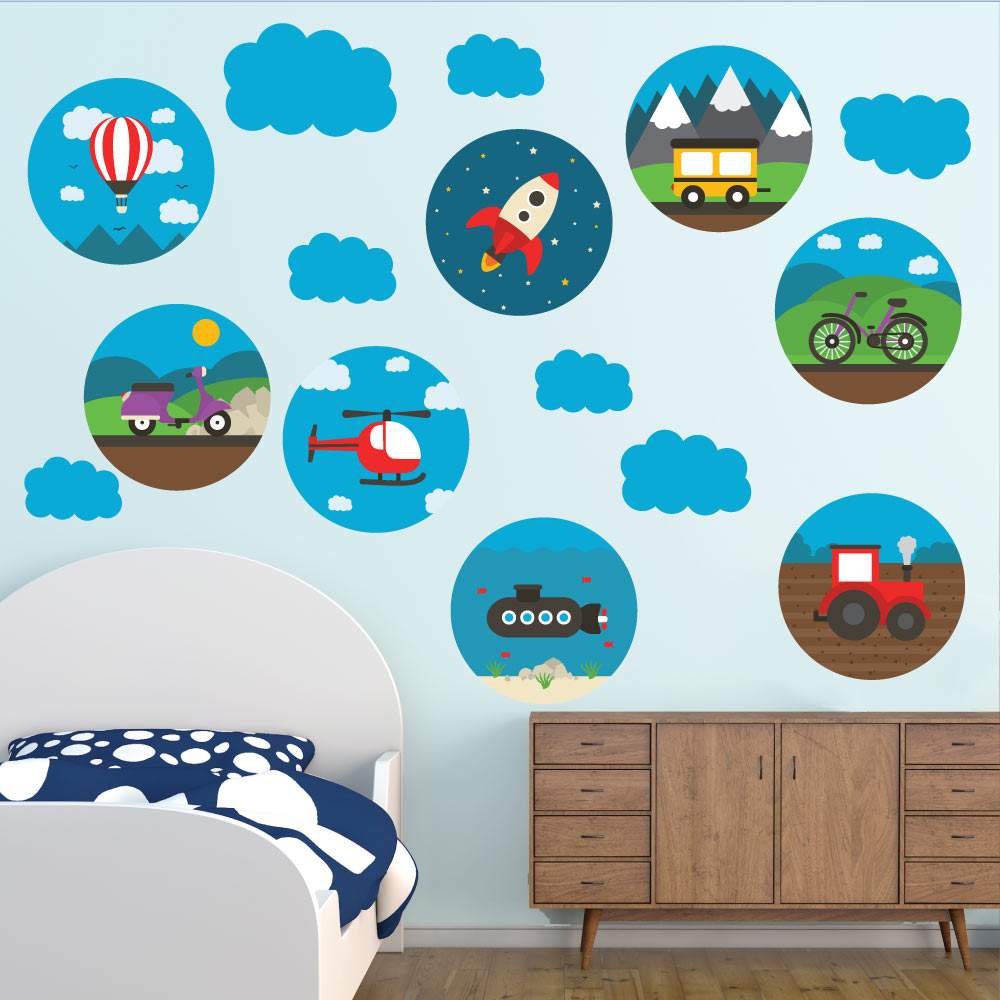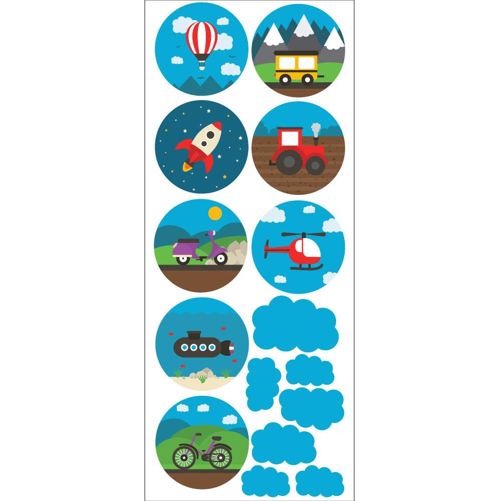 Αυτοκόλλητο για παιδικό δωμάτιο κύκλοι με μεταφορικά μέσα και μπλε συννεφάκια.