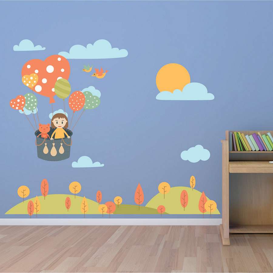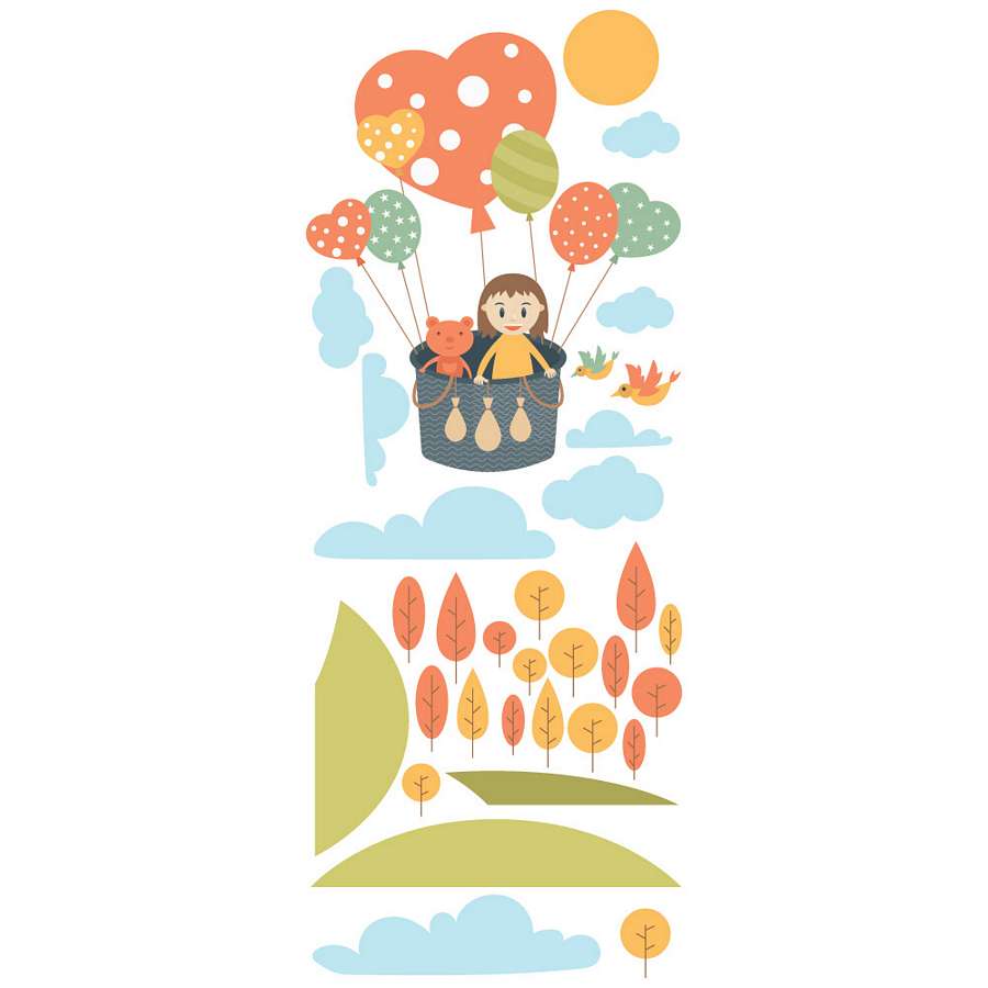 Αυτοκόλλητο για παιδικό δωμάτιο αερόστατο από μπαλόνια πάνω απο βουνά και δέντρα.