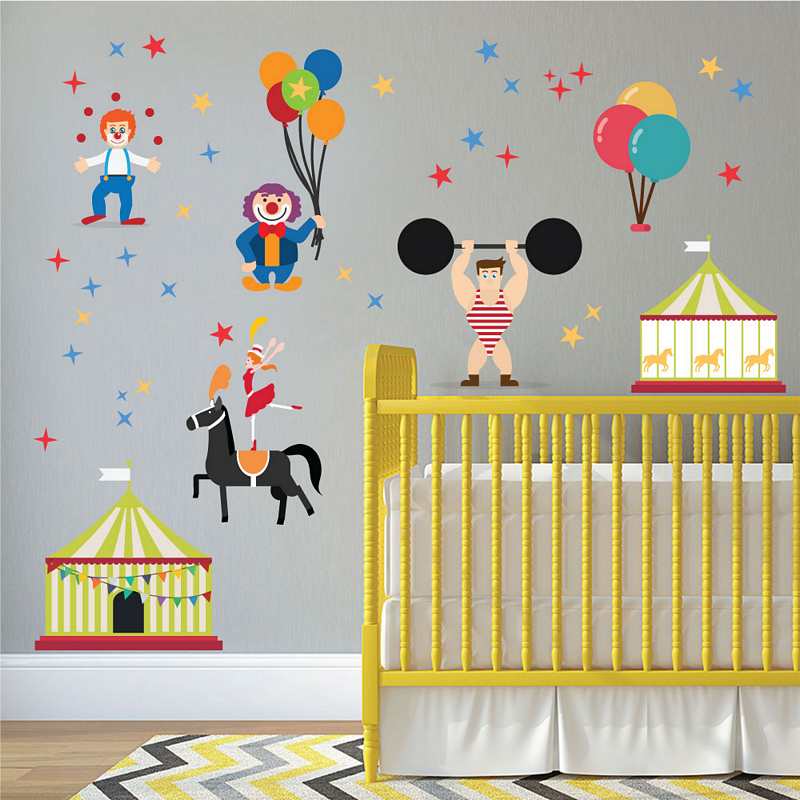 Αυτοκόλλητο για παιδικό δωμάτιο μπαλόνια, αστεράκια κλόουν και ακροβάτες σε τσίρκο.