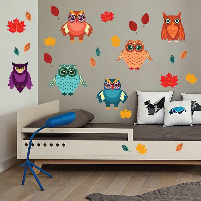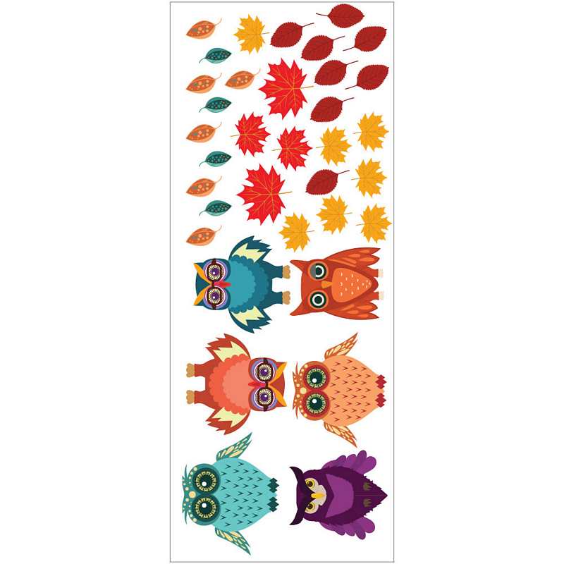 Αυτοκόλλητο για παιδικό δωμάτιο πολύχρωμες κουκουβάγιες και κόκκινα και κίτρινα φύλλα.