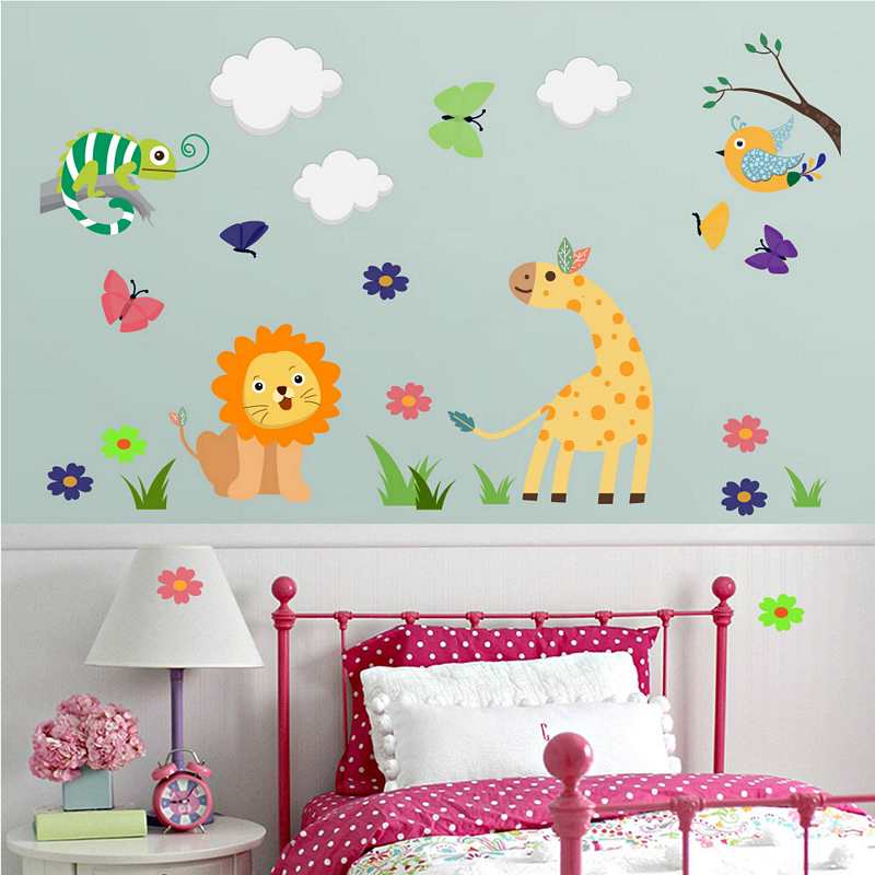 Αυτοκόλλητο για παιδικό δωμάτιο χαρούμενα ζωάκια του δάσους με λουλουδάκια, πεταλούδες και συννεφάκια.