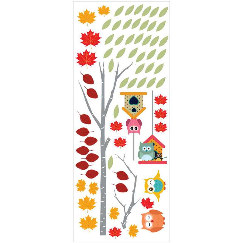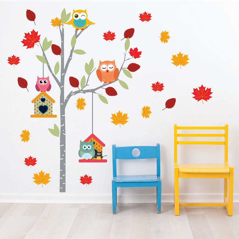 Αυτοκόλλητο για παιδικό δωμάτιο κουκουβάγιες πάνω σε δεντράκι και φύλλα που πέφτουν.