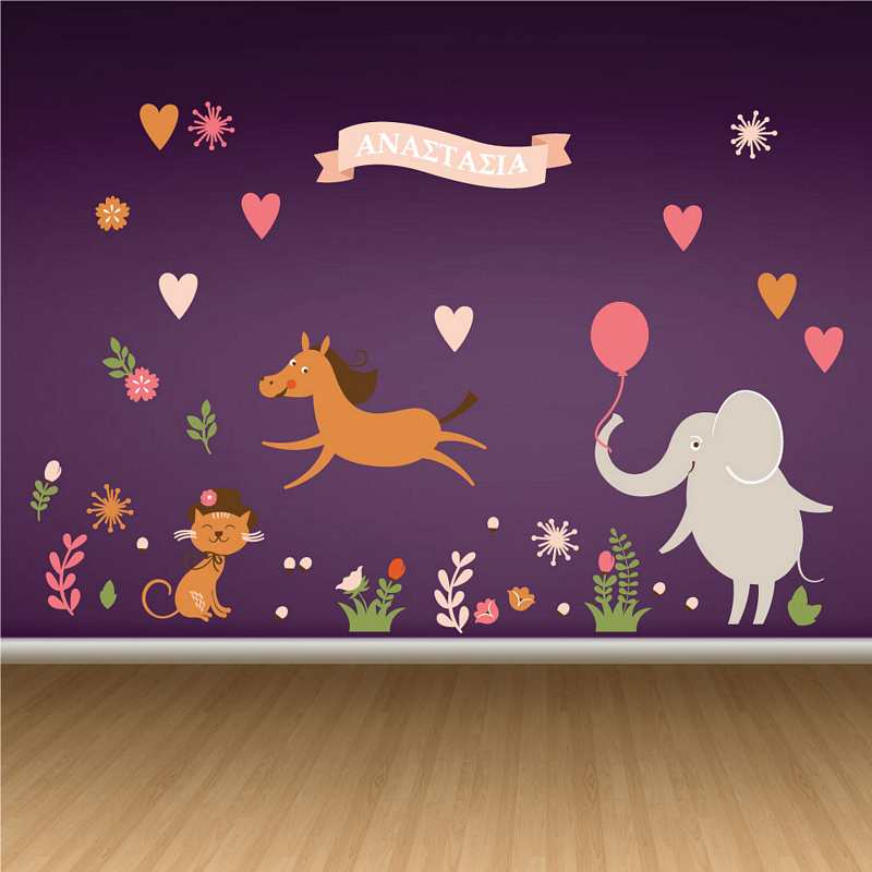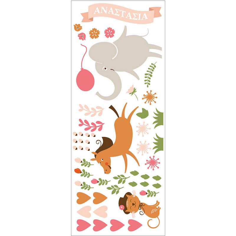 Αυτοκόλλητο για παιδικό δωμάτιο γάτούλα, ελέφαντας και αλογάκι ανάμεσα σε λουλουδάκια και καρδούλες.