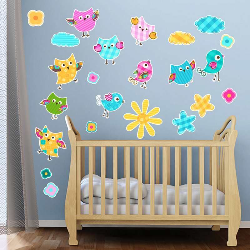 Αυτοκόλλητο για παιδικό δωμάτιο πολύχρωμα πουλάκια και λουλουδάκια.