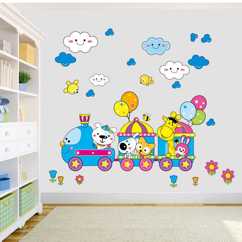 Αυτοκόλλητο για παιδικό δωμάτιο πολύχρωμο τρένο με ζωάκια, μπαλόνια και συννεφάκια.