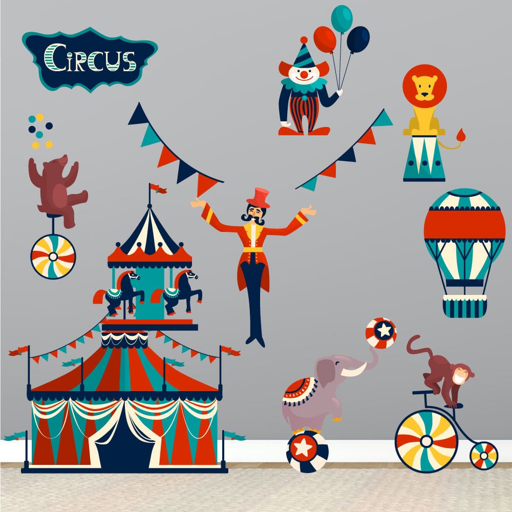 Αυτοκόλλητο για παιδικό δωμάτιο τσίρκο με ζωάκια και κλόουν σε διάφορα ακροβατικά.