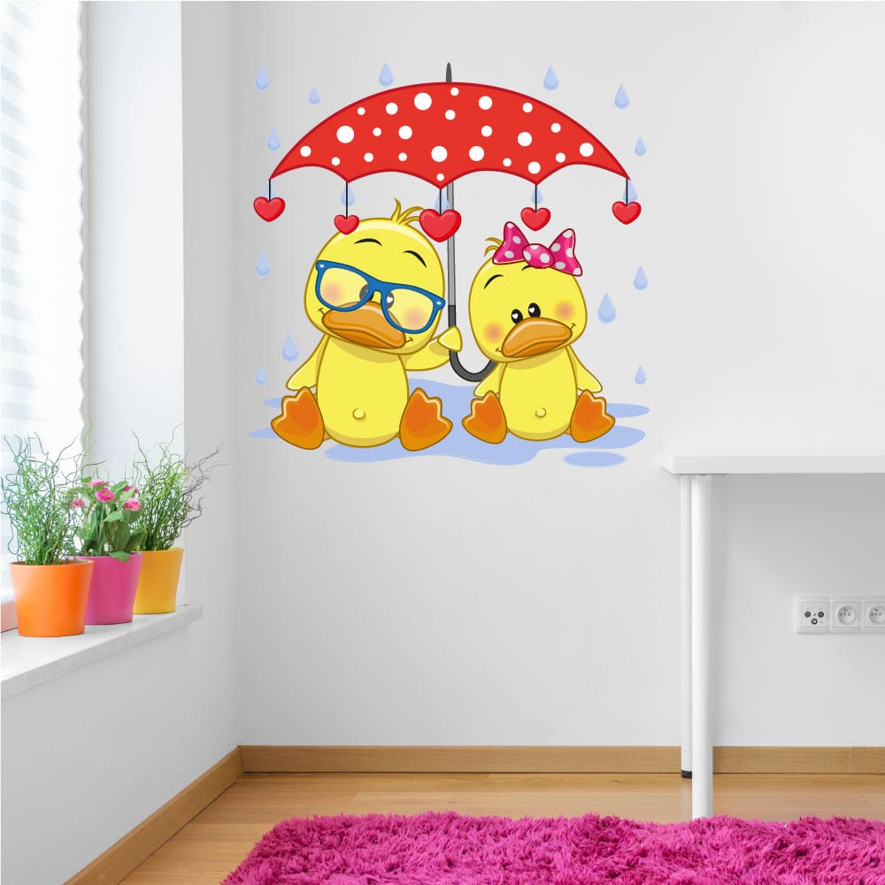Αυτοκόλλητο για παιδικό δωμάτιο παπάκια μέσα στην βροχή κρατώντας μια ομπρέλα.