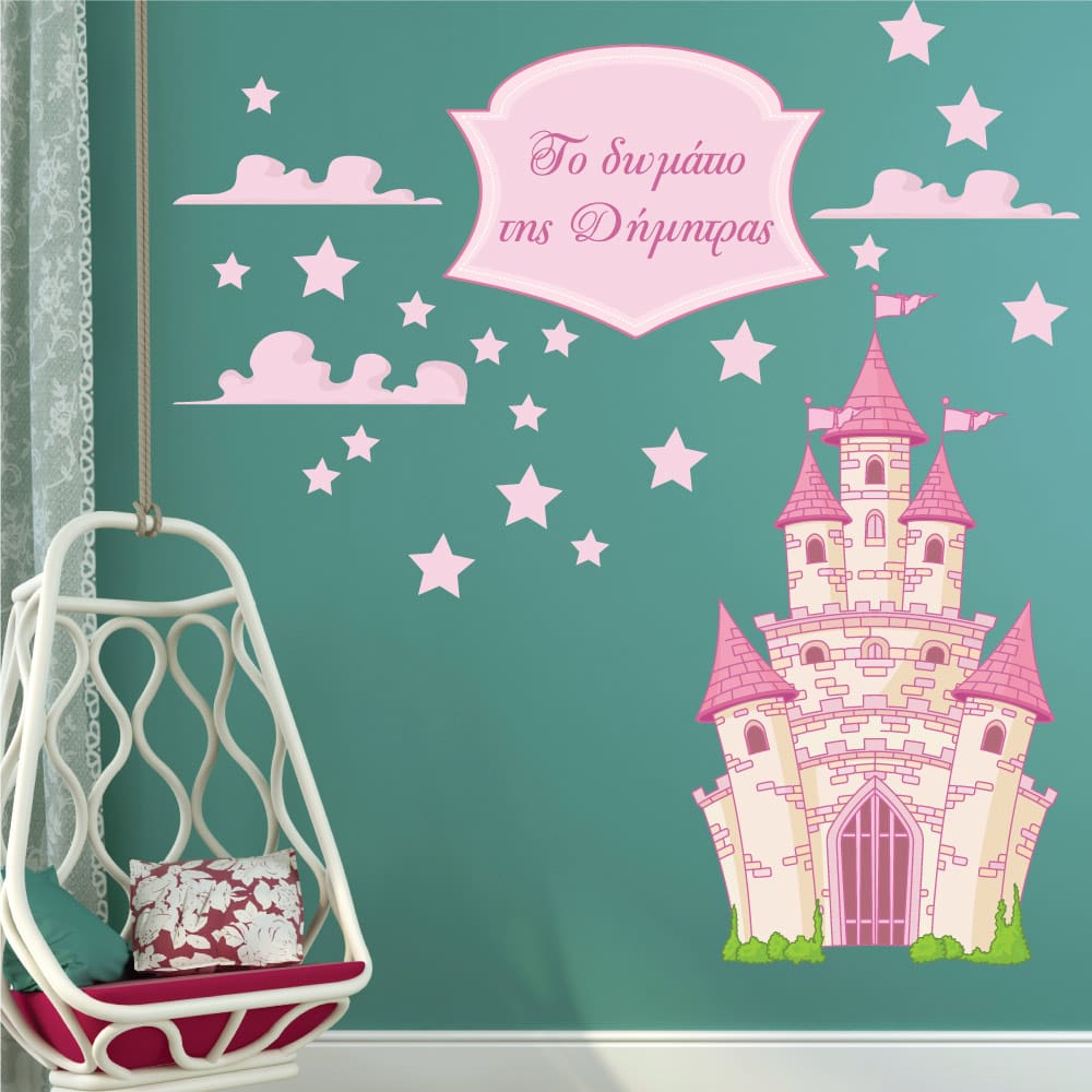 Αυτοκόλλητο για παιδικό δωμάτιο ροζ κάστρο και ροζ συννεφάκια και αστεράκια.