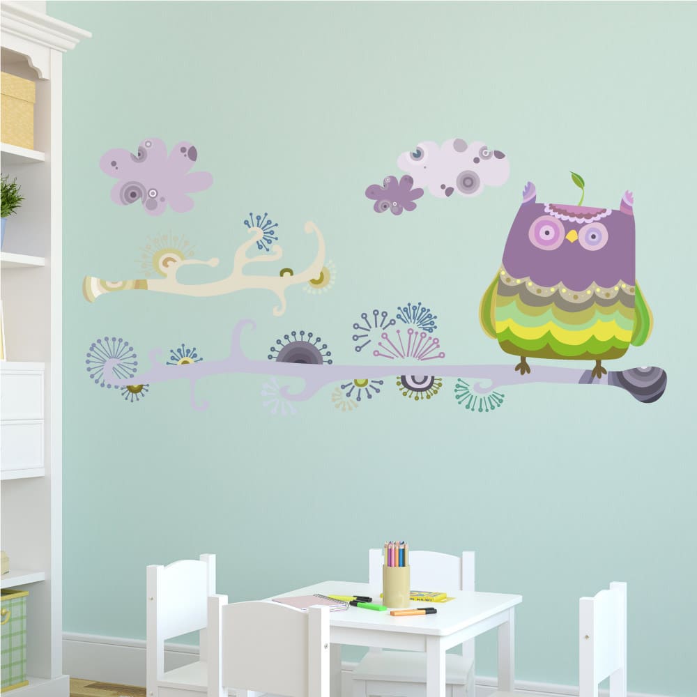 Αυτοκόλλητο για παιδικό δωμάτιο κουκουβάγια επάνω σε κλαδι και συννεφάκια.