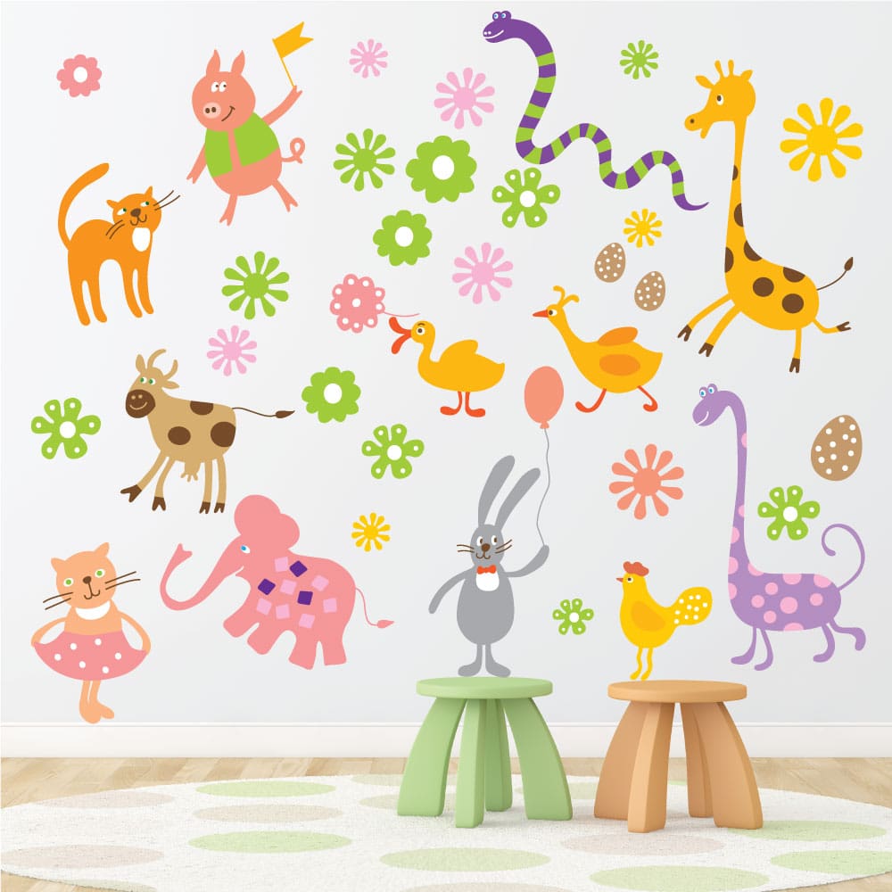 Αυτοκόλλητο για παιδικό δωμάτιο πολύχρωμα ζωάκια και λουλουδάκια.