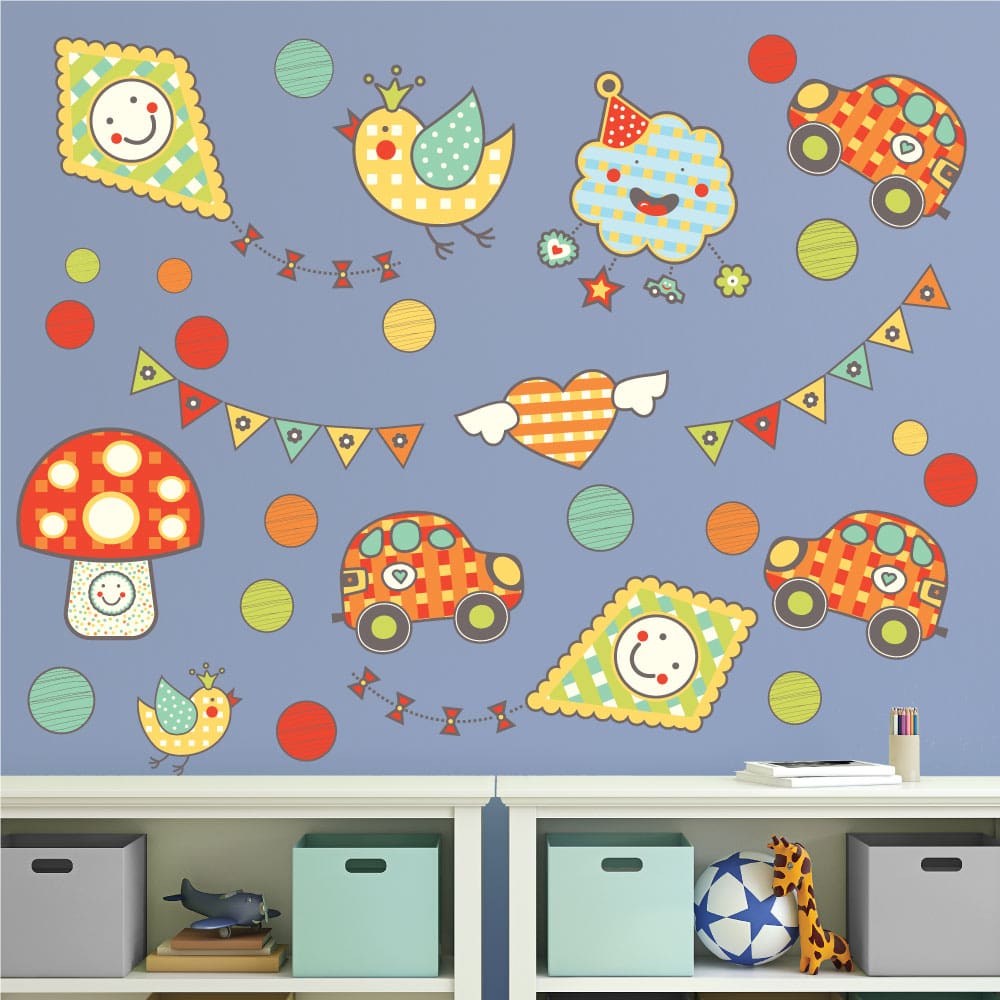 Αυτοκόλλητο για παιδικό δωμάτιο αυτοκινητάκια,πουλάκια,χαρταετοί και σημαιούλες σε χαρούμενα χρώματα.