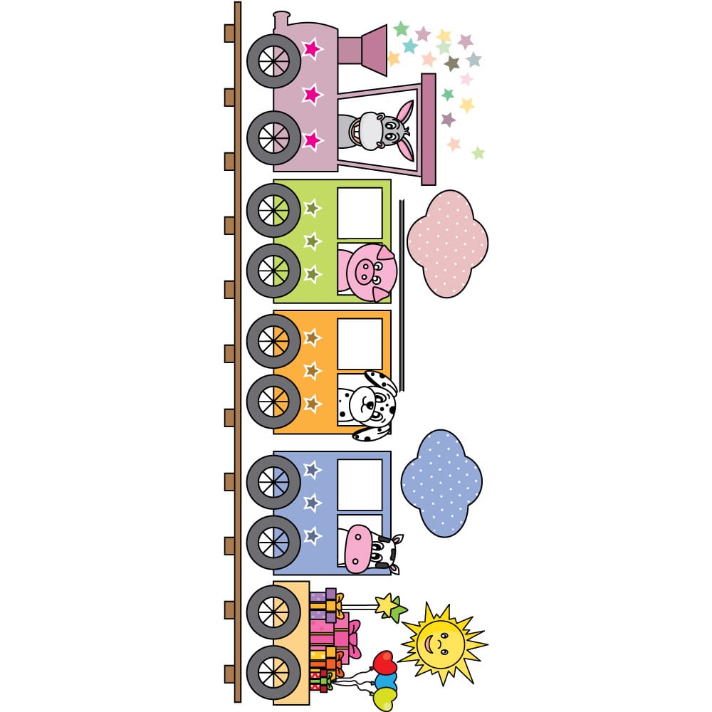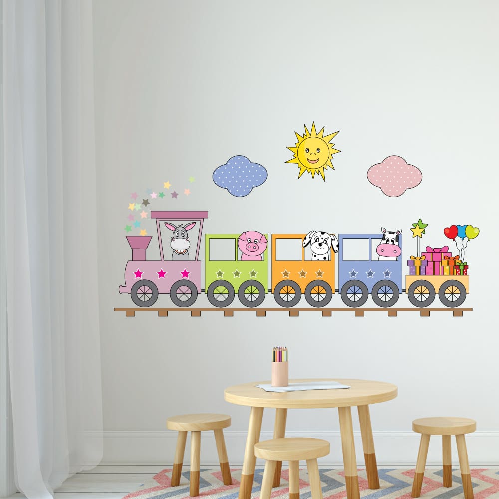 Αυτοκόλλητο για παιδικό δωμάτιο πολύχρωμο τρενάκι με ζωάκια και δώρα.