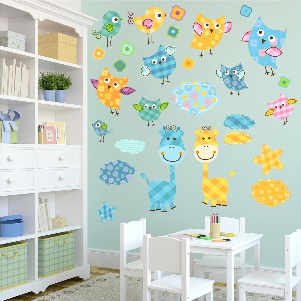 Αυτοκόλλητο για παιδικό δωμάτιο καμηλοπάρδαλη,κουκουβάγιες και πουλάκια σε υπέροχο καρό σχεδιασμό.